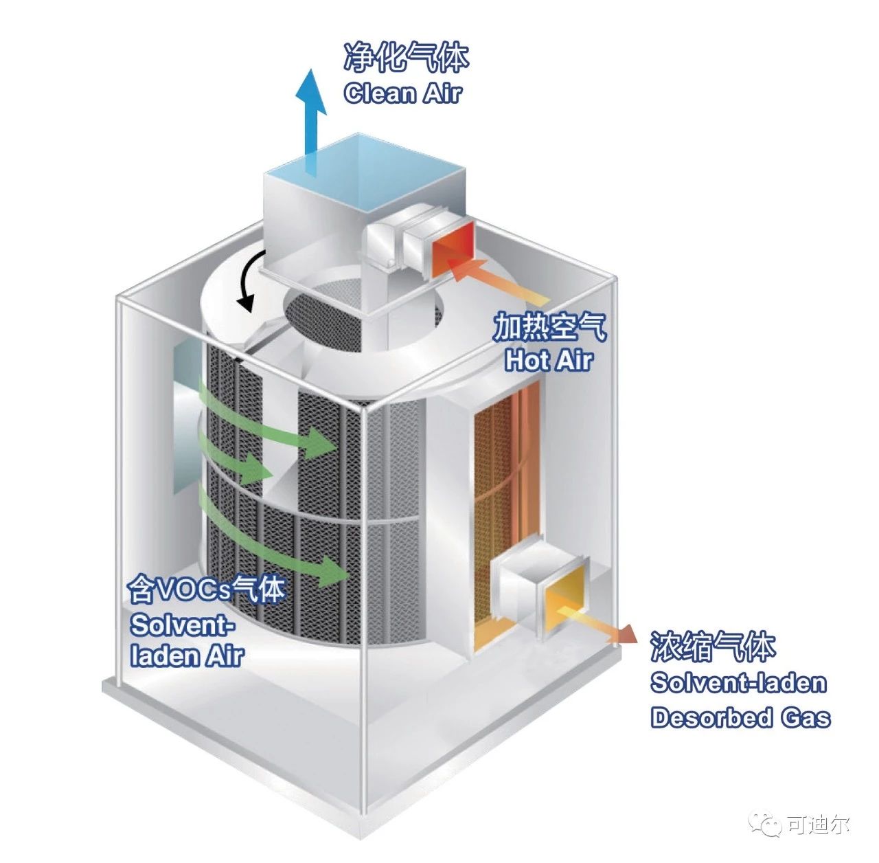 含有低濃度VOCs的廢氣通過蜂窩狀沸石時,VOCs成分被吸附在沸石中,凈化后的氣體排放到大氣中。此時,已吸附VOCs的蜂窩沸石繼續旋轉,通過少量的熱空氣對沸石模塊進行解吸再生,在此過程中,能夠將低濃度的廢氣濃縮成高濃度廢氣。