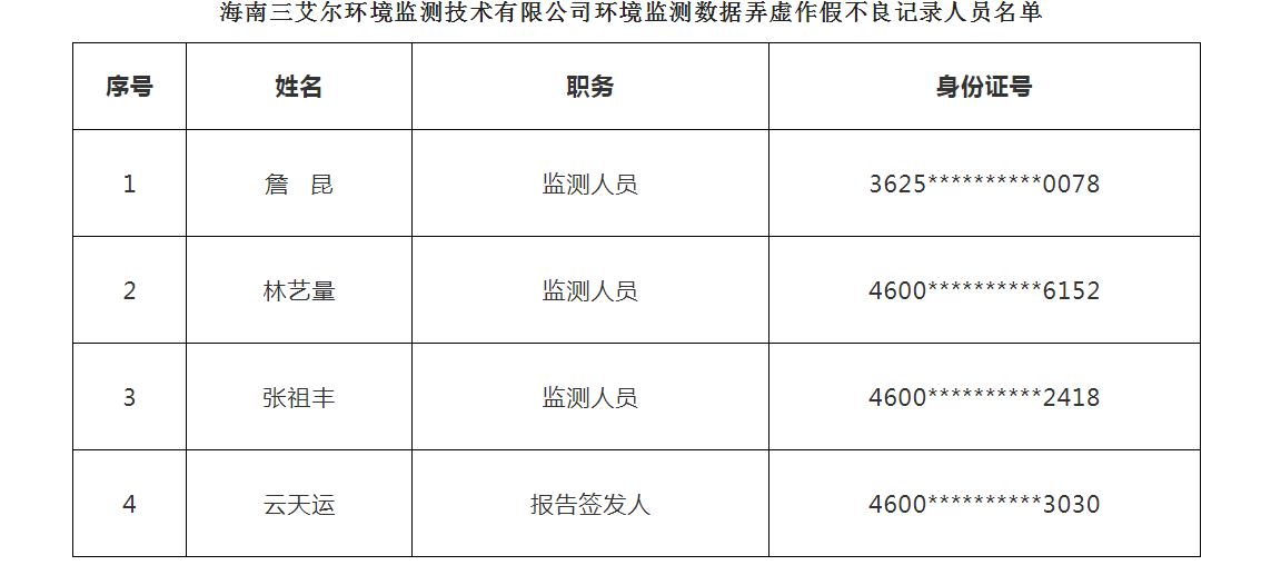海南省生態環境廳關于海南三艾爾環境監測技術有限公司及相關人員環境監測數據弄虛作假行為處理意見的函