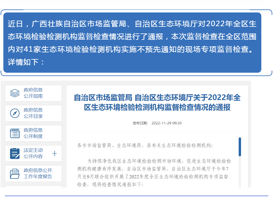 廣西壯族自治區(qū)市場(chǎng)監(jiān)管局 自治區(qū)生態(tài)環(huán)境廳關(guān)于2022年全區(qū)生態(tài)環(huán)境檢驗(yàn)檢測(cè)機(jī)構(gòu)監(jiān)督檢查情況的通報(bào)