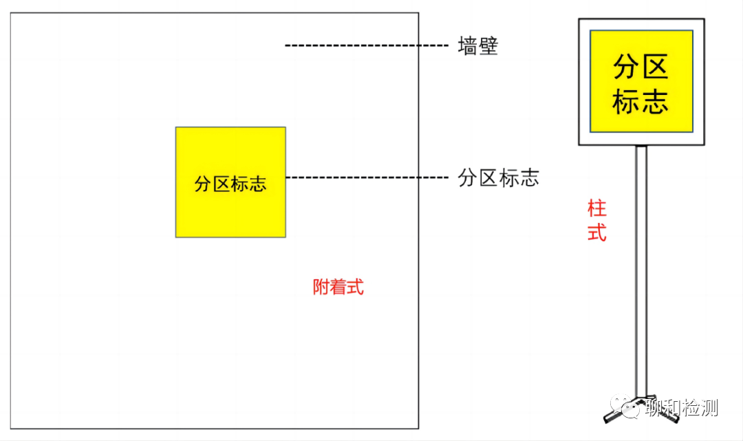 危險廢物貯存分區標志可采用附著式(如釘掛、粘貼等)、懸掛式和柱式(固定于標志桿或支架等物體上)等固定形式。